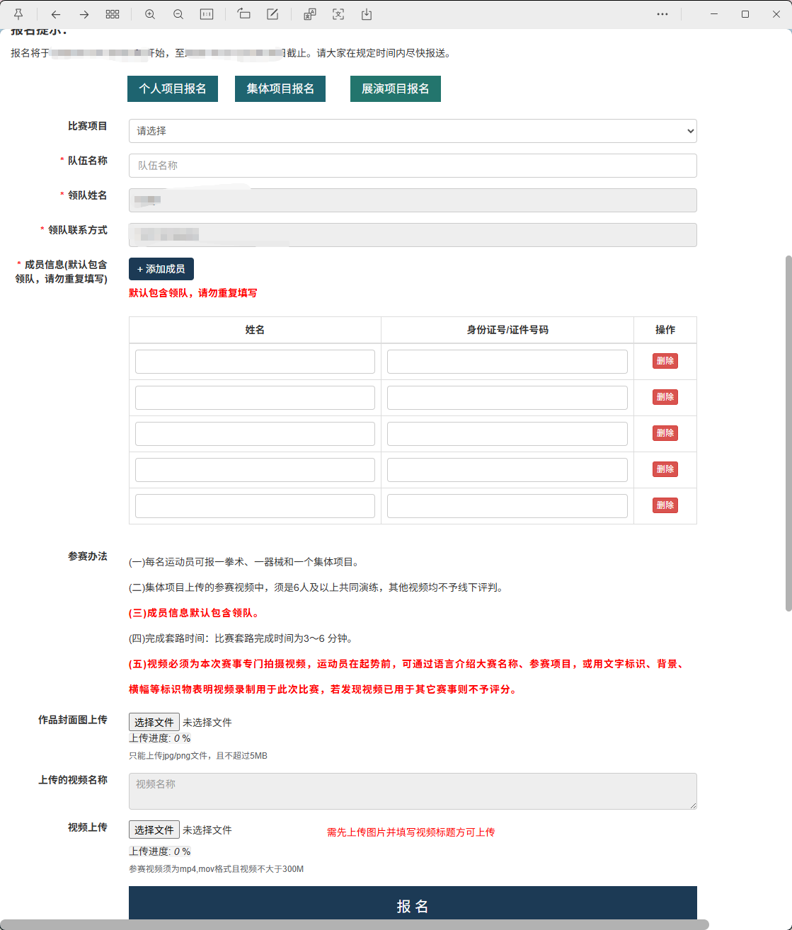 团体:选手姓名、身份证、联系方式、作品视频、作品封面图、报名表
